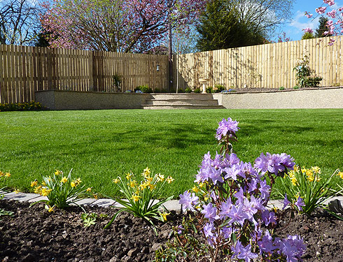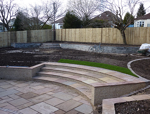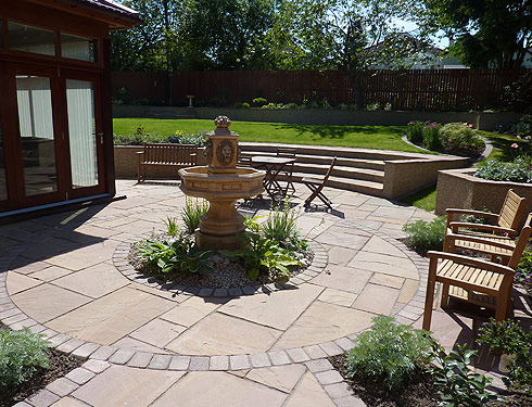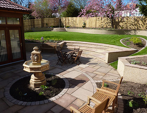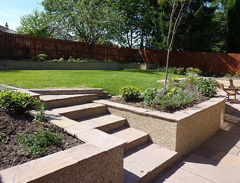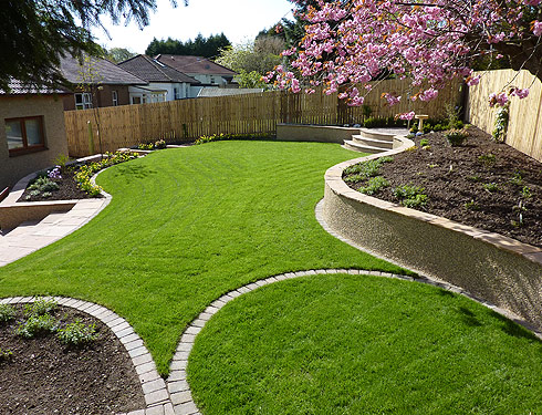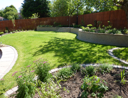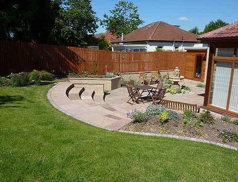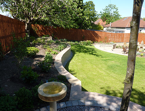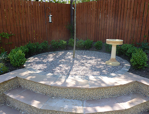 Suburban back garden in Glasgow This was originally a garden on one level. We put in a patio and feature as well as changing the levels to give the garden structure and inetrest